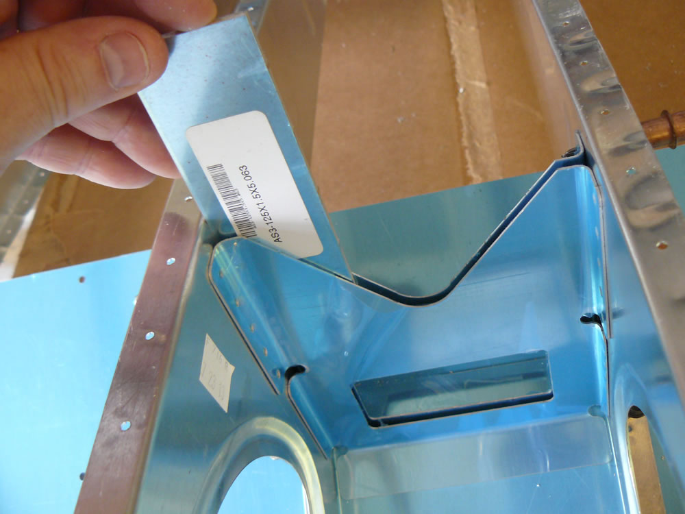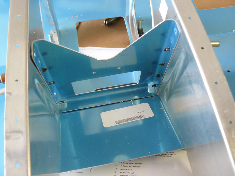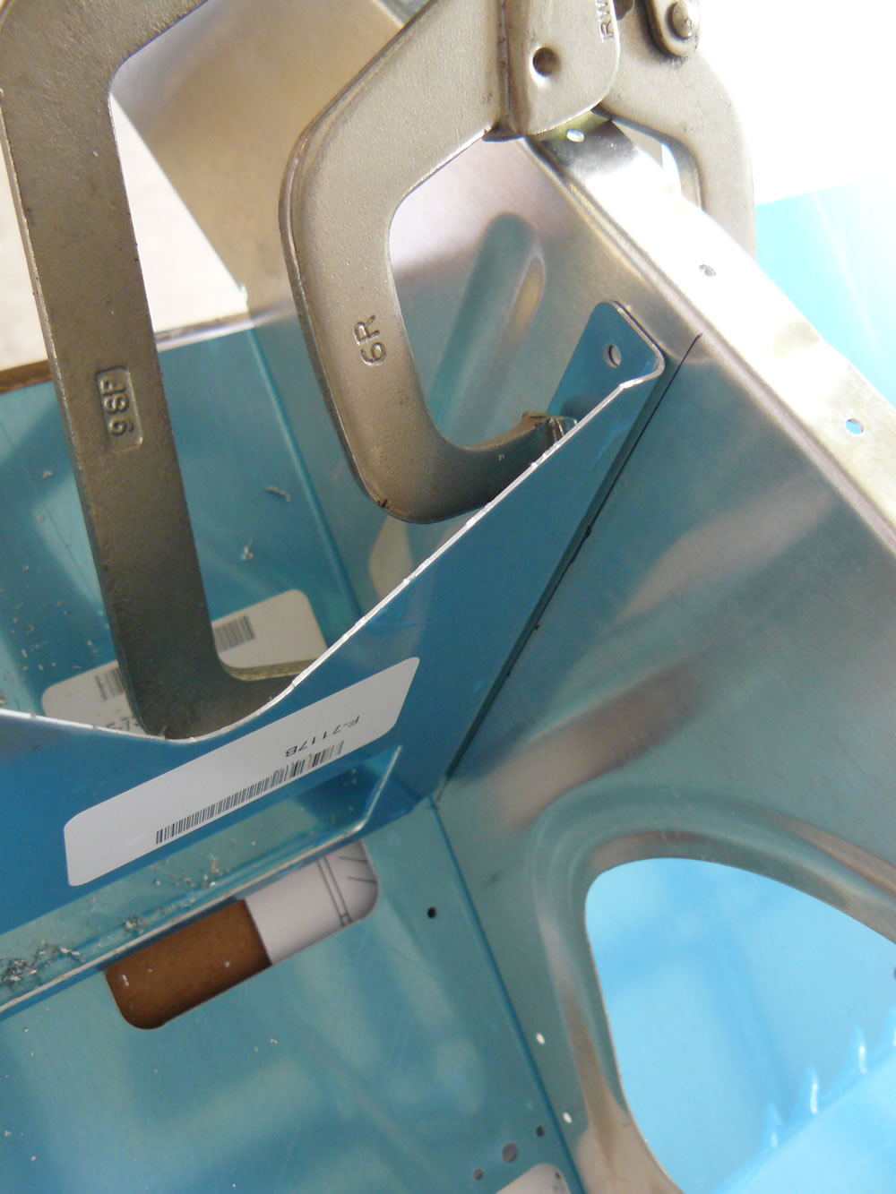 I clecoed the seat pan to a rib, then clamped the aft bracket in place to the drawn line. I used the seat pan to make sure the top of the bracket was flush to the seat pan.