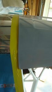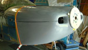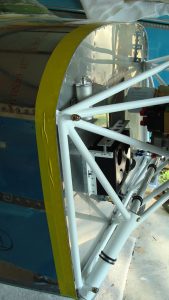 I ran 2″ tape around the firewall at the edge. This provides a known 2″ distance for cutting the aft edge of the cowl later on.
